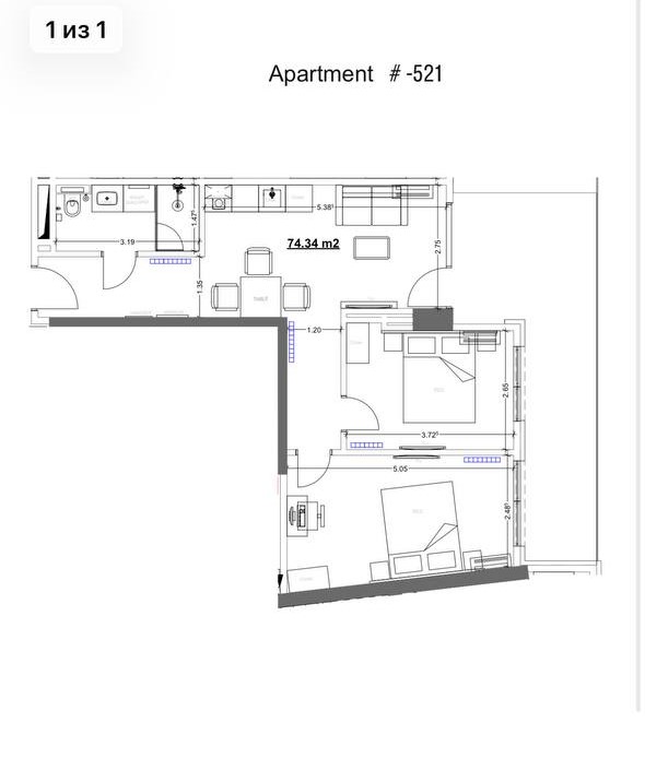 Площадь: 74.34 м² (оптимальна для семьи из 3-4 человек)