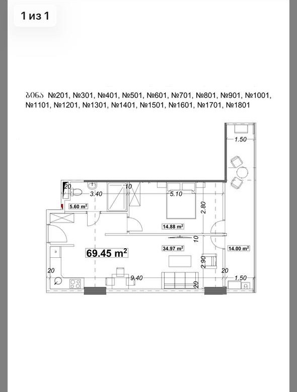Общая площадь квартиры составляет 69.45 м², что обеспечивает удобную планировку с отдельными спальнями и гостиной зоной. Квартира предлагается в состоянии «каркас», что дает возможность создать индивидуальный интерьер и реализовать собственный дизайн-проект.